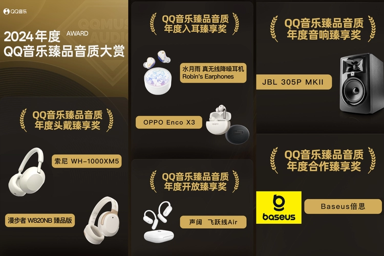 12月30日,QQ音乐重磅发布2024年度臻品音质大赏,旨在遴选过去一年在各个细分品类通过臻品音质认证的音频硬件相关产品与品牌,树立行业新标杆。此次评选在中国电子音响行业协会和中国声学所的专业指导下进行,QQ音乐臻品认证评审团秉持权威公正原则,对通过认证的超30家品牌、50多款产品进行年度评选。最终,7款产品凭借卓越品质及优异的市场表现荣膺「QQ音乐臻品音质·2024年度臻享奖」:QQ音乐臻品音质·年度头戴臻享奖”漫步者W820NB 臻品版和索尼WH-1000XM5, “QQ音乐臻品音质·年度入耳臻享奖”水月雨梦回TWS和OPPOEnco X3,“QQ音乐臻品音质·年度开放臻享奖”声阔AeroFit 2,“QQ音乐臻品音质·年度音响臻享奖”JBL 305P MKII以及“QQ音乐臻品音质·年度合作臻享奖”倍思。