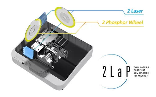 藤井智也:我们从2021年开始研究,如何将LD光源无损输出投射到屏幕上。 传统的激光光源引擎使用一个荧光轮用于多个激光模组的设计,RK500UST使用2LaP技术,采用两个激光光源使用两个荧光轮的结构,减少了单个荧光轮的光通量并最大限度地提高了光转换效率。