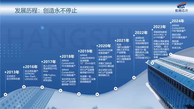 自2013年成立以来,从默默无闻到崭露头角,逐步成为国产半导体行业的重要力量。成立至今累计出货量达到50+亿颗,核心专利200+项,已量产数/模混合8寸130nm至12寸40nm七种工艺平台,ARM及RISC-V等十二大家族百余款32位MCU,服务于汽车、工业、家电、物联网等领域的数五千家客户。