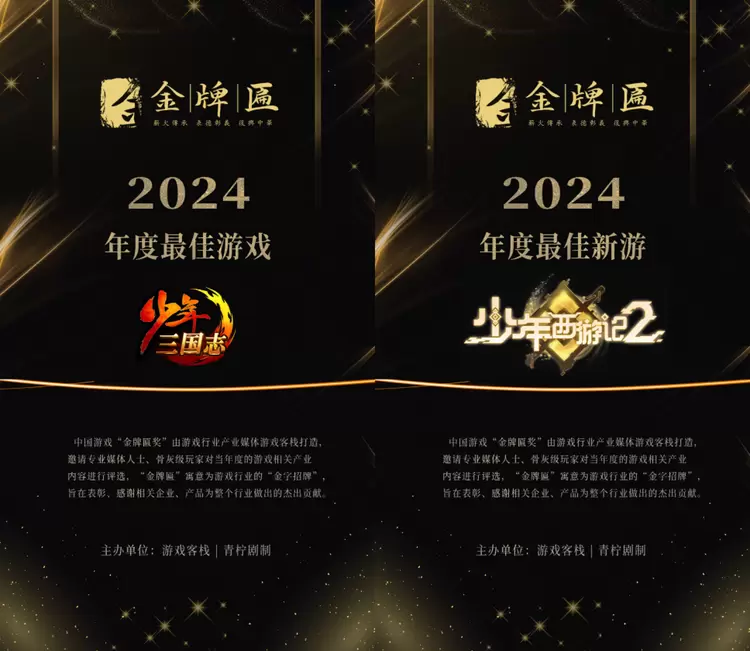 游族网络《少年三国志》《少年西游记2》斩获2024年中国游戏“金牌匾”双项大奖