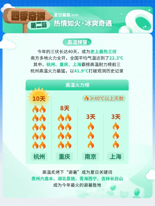 夏季是三伏天的主场。今年三伏,全国平均气温达到23.24℃,为史上最热。其中,杭州、重庆、上海霸榜高温耐力榜前三。高温之下,除了躲在房间吹空调,贵州六盘水、湖北恩施、青海西宁、吉林长白山等地因气候凉爽频频出圈,成为今年热门避暑胜地。