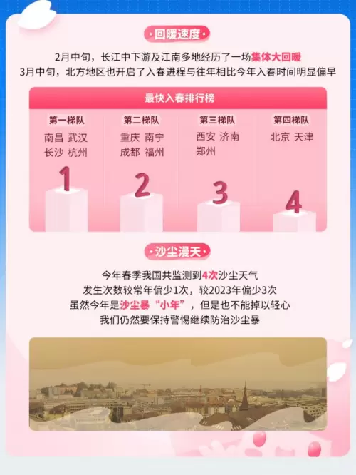 同样值得关注的气象是各地的回暖速度,南昌、长沙、武汉、杭州等地位居“入春第一梯队”,3月中旬,北方多地也纷纷开启入春进程。今春,我国春季沙尘天气总体上呈现次数减少、强度减弱的趋势,沙尘防治初见成效,但仍需警惕局部强沙尘暴的发生。