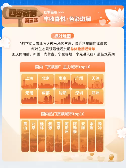 9月下旬以来,北方大部分地区的气温接近常年同期或偏高,这一气象条件给红叶生态景观的最佳观赏期带来积极影响。各地“赏秋游”热度快速升温,成为文旅市场的一道亮丽风景线。黄山、北京、桂林、婺源、南京、阿坝州、阿勒泰、安顺、本溪、腾冲等城市,凭借其迷人的红叶景观和丰富的秋季旅游资源,成功跻身国内热门赏枫城市top10。