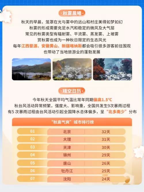不仅仅是艳丽如火的枫叶,如梦如幻的秋雾、馥郁芬芳的桂花,以及秋高气爽的蓝天……都是秋日独特的限定美景,为游客们带来了丰富多彩的旅游体验。其中,适宜的气象条件为赏秋游提供了绝佳的自然环境,更是为“赏秋经济”的繁荣注入了强劲动力。
