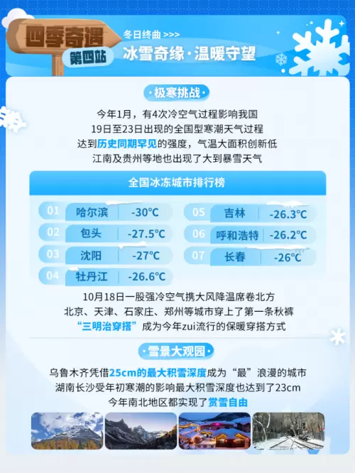 今年1月,4次冷空气过程带来“极寒挑战”,其中19日至23日出现的全国型寒潮天气过程尤为猛烈,其强度在历史同期中实属罕见,导致全国大范围地区的气温创新低。在这场寒潮中,江南及贵州等地也出现了大到暴雪天气,给当地居民的生活带来不小的影响。全国冰冻城市排行榜上,哈尔滨、包头、沈阳、牡丹江、吉林、呼和浩特、长春等城市的气温纷纷跌破冰点,其中哈尔滨更是低至-30℃,寒冷程度可见一斑。冷空气来袭还催生出一种新型的穿搭方式——“三明治穿搭”,成为备受欢迎的保暖潮流。冬日,雪景也是一大看点,今年南北地区都实现了赏雪自由,乌鲁木齐凭借25cm的最大积雪深度成为“最”浪漫的城市。南北地区气象各异,自然景观各不相同,也为游客们呈现了更多元化的旅游体验。