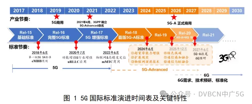 ITU定义的5G的三大应用场景分别为增强移动宽带(eMBB)、超高可靠低时延(uRLLC)和海量物联网通信(mMTC)。3GPP的5G国际标准制定节奏及各版本关键特性如图所示,通过R15、R16和R17三个版本,形成对5G三大应用场景的标准支撑,5G-A系列标准在R18及后续版本中进行进一步性能增强和功能拓展,探索6G潜在关键技术。
