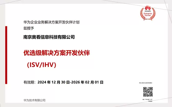 奥看科技升级获颁华为优选级解决方案开发伙伴