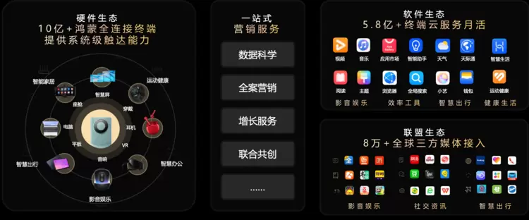 为什么说是全场景?这里除了前面所说的软硬件结合,以及媒体生态规模,很重要一点就是:可以用一个帐号连接全域数据,通过系统级入口和三方生态级入口,用连续性的媒介触点,为品牌提供快、全、准的数据洞察和场景化营销方案。如此,鲸鸿动能全场景生态体现了3个大的优势。