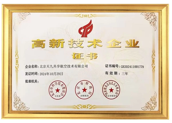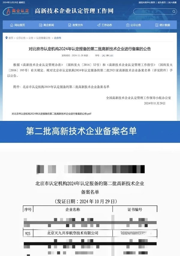 近日,国家高新技术企业认定管理工作网发布“对北京市认定机构2024年认定报备的第二批高新技术企业进行备案的公告”,北京天九共享航空技术有限公司名列其中,3年后顺利通过国家高新技术企业复审认定,再次获得这一殊荣。