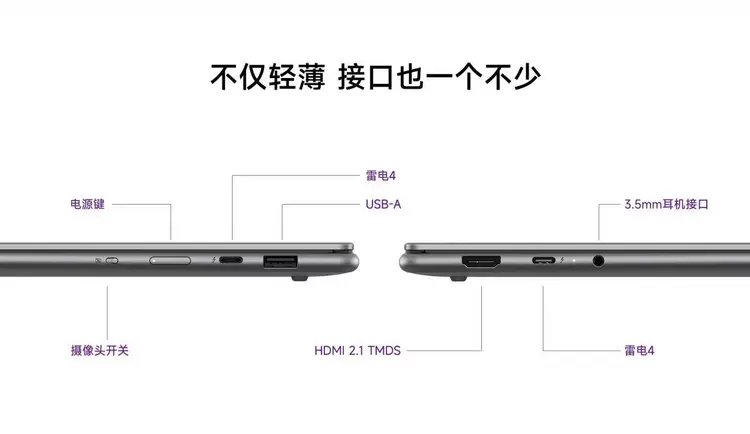 在接口配置方面,联想YOGA Air 15 Aura AI元启版提供了全面的连接选项。机身右侧配备1个USB Type-A接口和1个雷电4接口,同时集成了电源键与摄像头物理开关;左侧则设有标准HDMI视频接口、1个雷电4接口和3.5mm耳麦插孔。这样的接口组合能够满足用户在日常办公和创作中的各类外接需求。