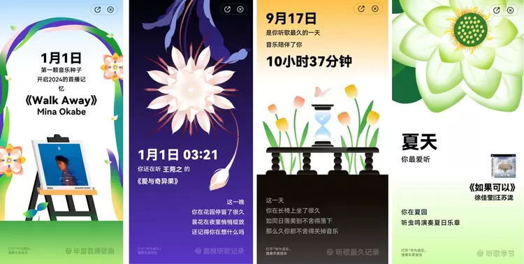 音乐也是一种情绪的表达,从歌曲的收听记录也许还能回忆起当时听歌的心情。而华为音乐2024年度听歌报告还从年度首播歌曲、最常听歌时段、最晚听歌时间、单日循环最多歌曲、四季听歌数据等这些特别维度,帮用户构筑起回忆的拼图,透过音乐回味这一年里经历的生活点滴。
