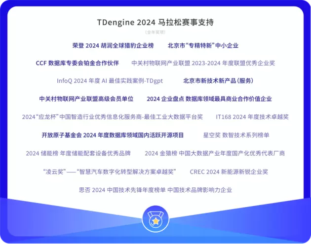 在 2024 年,TDengine 在多个领域取得了显著成就,荣获了多个重要奖项与荣誉——荣膺 2024 储能榜年度储能配套设备优秀品牌、2024 企业盘点数据库领域最具商业合作价值企业、北京市“专精特新”中小企业,荣登 2024 胡润全球猎豹企业榜,并成为中关村物联网产业联盟高级会员单位、CCF 数据库专委会铂金合作伙伴等多个重量级机构的成员。