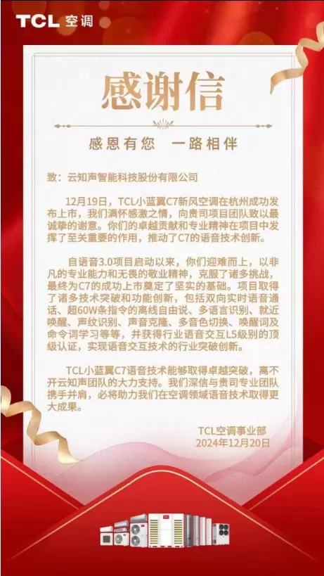 近日,云知声收到一份特别的新年礼物——一封来自TCL的感谢信,再次温暖了云知声团队的心。信中特别赞扬了云知声在TCL小蓝翼C7新风空调语音3.0项目中的卓越贡献和专业精神。以下为感谢信原文:
