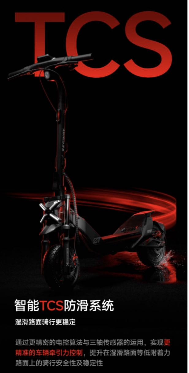 在强动力与长续航的坚实基础上,九号滑板车ZT3 Pro构建了全方位的安全防护体系。其搭载的Segride增稳系统,以约70mm的大拖曳距与74˚立杆倾角设计,结合创新燕把,显著提升了操控稳定性。其次,智能TCS防滑系统的运用,让这款滑板车在湿滑路面实现了更精准的车辆牵引力控制,确保每一步都稳健前行。