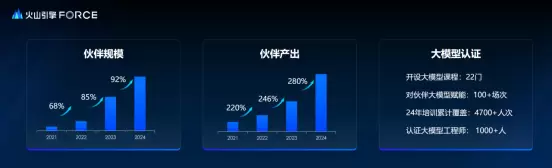 经过四年发展,火山引擎已经构建了完善的生态体系。早期是围绕产品能力、服务能力、销售能力构建的1.0版生态,现在是涵盖算力层、模型层、应用层三环布局的大模型生态2.0版。如今,火山引擎合作伙伴规模达到5000多家,赋能伙伴产出增长超200%。