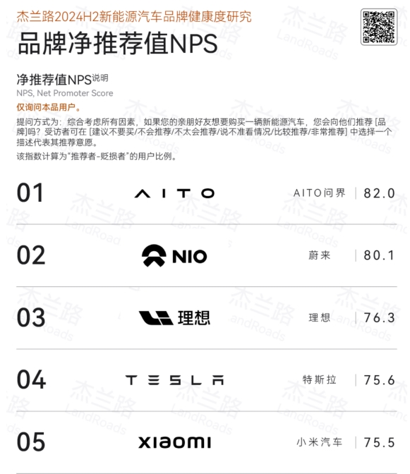 据1月2日发布的《杰兰路2024年度下半年新能源汽车品牌健康度研究》报告显示,问界在净推荐值(NPS)榜单中表现优异,取得了高达82.0的NPS评分,位居行业榜首。