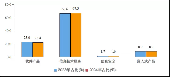 信息技术服务收入保持两位数增长。2024年前11个月,信息技术服务收入82674亿元,同比增长11.8%,占全行业收入的67.3%。其中,云计算、大数据服务共实现收入12691亿元,同比增长10.5%,占信息技术服务收入的15.4%;集成电路设计收入3335亿元,同比增长14.8%;电子商务平台技术服务收入11173亿元,同比增长8.7%。