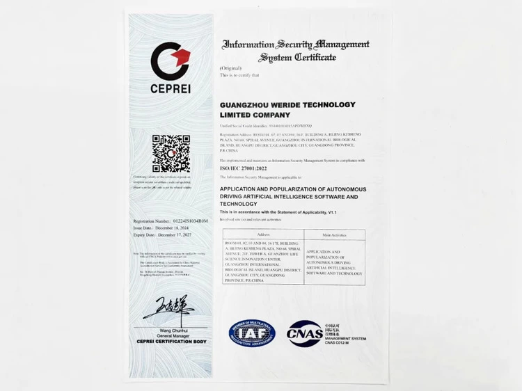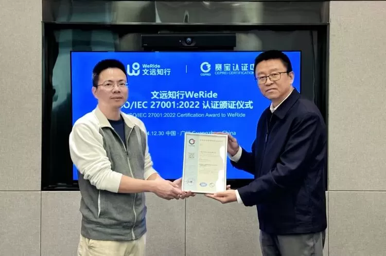 2024年12月30日,文远知行WeRide(Nasdaq : WRD)正式宣布通过ISO/IEC 27001:2022信息安全管理体系认证(以下简称“ISO/IEC 27001认证”),由工业和信息化部电子第五研究所全资子公司赛宝认证中心颁发证书。这一认证标志着文远知行在信息安全管理领域的体系化建设已达到国际权威标准,为全球化发展和跨行业合作提供了重要保障。