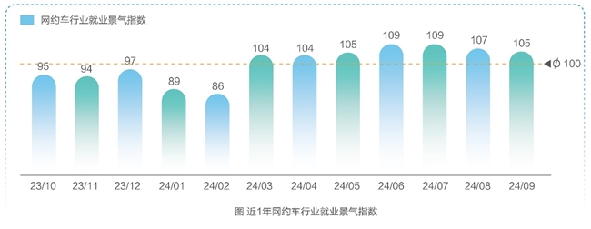 从就业景气程度来看,近一年来(2023年10月至2024年9月),网约车行业就业景气指出呈“春节前波动下降,春节后逐月扩张”的态势,6月份达到全年最高点。58同城招聘研究院分析认为,这与行业经历了上半年的强劲增长后开始进入调整期有关;其次或受季节性因素、市场饱和度以及经济环境等外部因素影响。