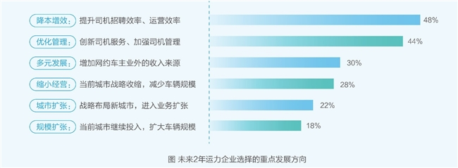 面对行业竞争的加剧,“降本增效”已成为运力企业的必选项。根据调研结果,48%的企业计划通过提高司机招聘和运营效率,降低招聘成本、改善经营效率。同时,司机的高流失率也给企业带来运营挑战,44%的企业计划通过创新的司机服务和加强在职司机管理,以减少司机的流失。
