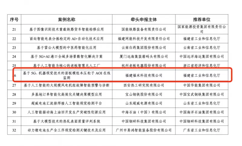 2024年12月31日,《工业和信息化部办公厅关于印发人工智能赋能新型工业化典型应用案例名单的通知》在工信部官网上正式公布,确定了151项人工智能赋能新型工业化典型应用案例。福建省共有6家企业入选。达华智能(集团)参股企业福米科技“基于 5G、机器视觉技术的面板模组本压粒子 AOI 在线监测”项目经福建省工信厅推荐,入选行业应用方向。