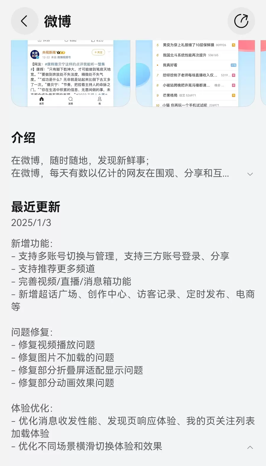 正在使用原生鸿蒙的小伙伴们注意了!最近鸿蒙原生版微博更新至1.12.0版本,新增了多账号切换、超话广场、创作中心等超多功能,社交、创作、视频、直播乃至购物等各方面功能都已经相当完善。同时,鸿蒙原生版微博还支持“小艺帮写”等原生鸿蒙独有的功能,使原生鸿蒙用户在“随时随地发现新鲜事”的同时,获得更丰富、更便捷、更畅快的社交体验。
