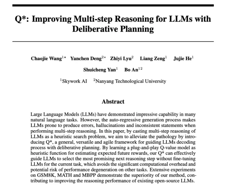 Q*是一种通过借鉴人类大脑中“system 2”的思考方式,我们将大型语言模型(LLMs)的多步推理视作一个启发式搜索问题,并提出Q*线上推理框架配合模型在线思考,用以在推断过程中进行审慎规划,从而指导 LLM 的解码过程。具体来说,Q*通过学习一个 Q-value 模型作为启发式函数来估计预期的未来回报,从而能够在不针对当前任务微调 LLM 的情况下,有效地指导 LLM 选择最有前景的下一步推理。基于天工自研的Q*线上推理算法配合模型在线思考,不仅避免了大量的计算开销,也降低了在其他任务上性能退化的风险。