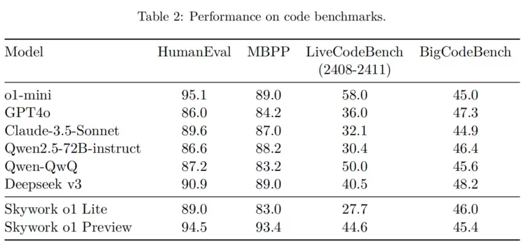 表2丨Skywork o1在代码基准评测上的表现