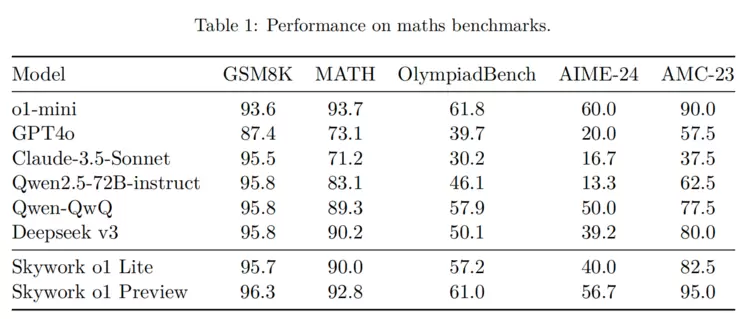 表1丨Skywork o1在数学基准评测上的表现