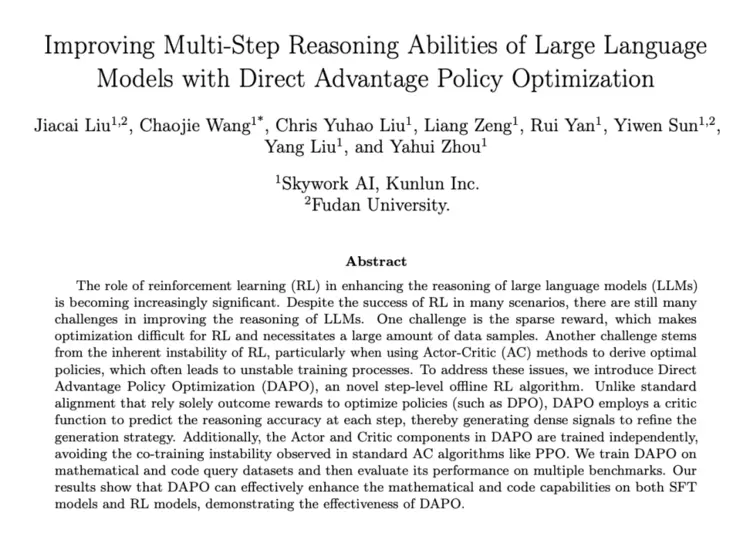 针对现有RLHF算法在落地过程中存在奖励信号稀疏,训练效果不稳定,计算资源开销过大等问题,昆仑万维天工团队提出了一种新的step-level离线强化学习算法,DAPO 首先使用一个评估函数来预测每一步的推理准确性,从而为优化生成策略提供密集的信号,随后DAPO 会根据每个状态-动作对的优势来调整策略比率,从而优化推理步骤的生成。此外,DAPO 中的 Actor 和 Critic 组件分别独立训练,避免了在类似 PPO 算法常见的“Actor-Critic”共同训练不稳定问题。