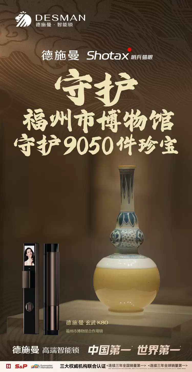 当古老文明与现代科技相遇,会碰撞出怎样的火花?德施曼“珍宝守护计划”一路前行,历经敦煌艺术馆、黑龙江省博物馆、吉林省博物院、云南省博物馆、通化市博物馆,终至福州,携手福州市博物馆,开启“珍宝守护计划”最终站,德施曼玄武·紫禁城K80成为“福州市博物馆合作用锁”;德施曼Shotax哨兵猫眼,守护福州市博物馆,守护9050件珍宝。