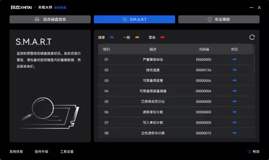 在S.M.A.R.T界面,我们可以看到它非常全面的监测和预警,相关状态会通过蓝、黄、红三色进行状态显示,方便我们快速了解情况。