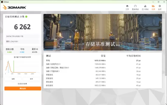 我们再来看3DMark这边的成绩。致态TiPro9000的最终成绩为6262分。3DMark显示目前平均分在2222左右,从下方的图形可以看出,绝大部分的SSD都是低于5000分的。致态TiPro900的成绩在所有结果中都是非常靠前的,如果排除掉那些非消费级的“怪物”跑分,致态TiPro9000的成绩很有可能就是排在最前列的。