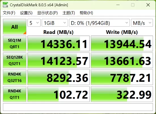 使用CrystalDiskMark进行实测,我们实锤了致态TiPro9000反向虚标的问题。不论是14336.11MB/s和13944.54MB/s的顺序读写速度,还是2067K/1990K IOPS的4K随机读写速度,都远超标称值,也远超早期的PCIe 5.0 SSD。