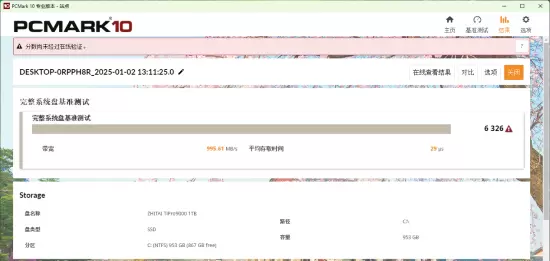 在PCMark10完整系统盘基准测试的实测中,致态TiPro9000获得了6326分的总分,其带宽高达近1000MB/s。这个成绩远高于目前PCIe4.0 SSD普遍的3500分以及不到600MB/s的带宽,分数虽然没有实现翻倍,但差距已十分明显。