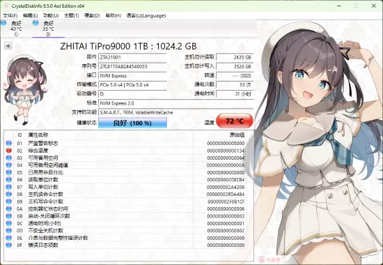 使用CrystalDiskInfo验明正身,我们便可以开始正式的实测,这里我们可以看到,致态TiPro9000的待机温度在35℃左右。