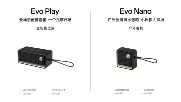Evo Play全场景便携音箱和Evo Nano户外便携防水小音箱:这两款音箱考虑到户外和便携性,将高级皮革纹理与金属编织网巧妙融合,增强了耐用性和防护性能。Evo Play搭载独特的2.1前后双向扬声器声学系统设计,搭配4单元旗舰声学配置与34W大功率,实现360°声场全覆盖,并具备IP66级防水功能,适合户外使用。Evo Nano则以其小体积和实用性为主,适用于户外场景,其具备IP67级别的防尘防水能力,支持双设备连接及TWS串联技术,提供长达10.5小时的播放时间(关闭氛围灯时)和6小时(开启氛围灯时)。音箱内置43mm高灵敏全频内磁喇叭和55mm大尺寸无源辐射器,拥有6W大功率,峰值可达12W,提供丰富的音效体验,并配备了多种氛围灯效果,增添使用乐趣。
