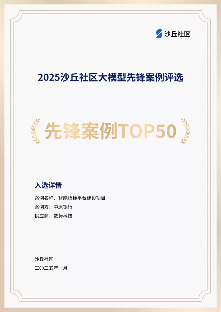 在人工智能蓬勃发展的浪潮中,大模型技术以其卓越的性能和广泛的应用前景,成为推动各行各业创新变革的关键引擎。为了深入挖掘大模型技术在不同领域的应用成果,彰显先锋企业的创新实力与行业引领作用。近日,知名数字化研究与服务机构沙丘社区发布《2025沙丘社区大模型先锋案例TOP50》,数势科技*中原银行智能指标平台建设项目入选此次先锋案例。