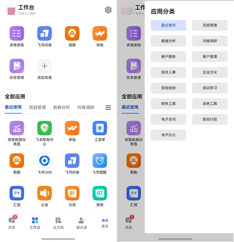 首先,鸿蒙原生版飞书进一步丰富了工作台中的应用,不仅支持了打卡、考勤、审批等20个常用的一方应用,满足了广大企业员工最关键的需求,同时也开放了所有三方应用,广大企业可以按需使用。此外,最新版鸿蒙原生版飞书更加细致的应用分类和应用搜索功能,也让查找所需服务变得更加方便。