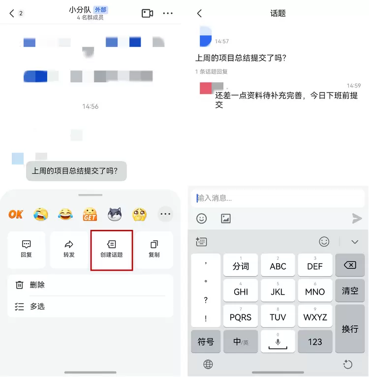 而在日常沟通聊天时,鸿蒙原生版飞书新上线的话题群与话题回复功能也很实用。比如想要针对某个事情单独讨论时,长按消息后选择“创建话题”即可对该对话进行独立回复,避免与群内其它信息混淆。此外在聊天时还可以多选消息转发,收到的视频文件也能直接打开查看了,帮助大家进一步提高工作效率。