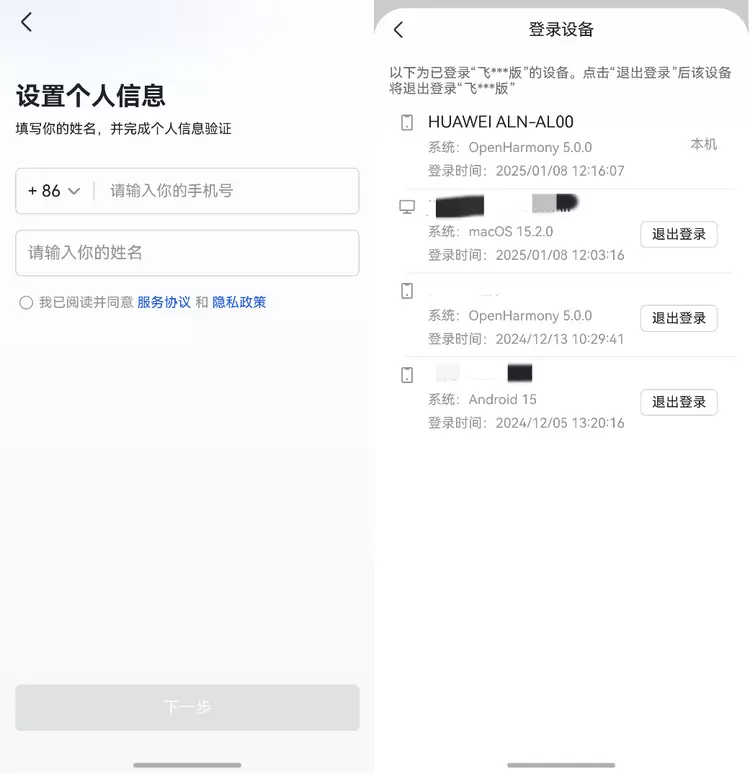 除上述功能外,鸿蒙原生版飞书还进一步完善了注册与登录的体验,目前已支持注册账号,并且可以扫码登录电脑端的飞书,不用再手动输入密码了;在主界面点击头像进入“登录设备”还能查看和管理同一账号登录的所有设备,退出不常用的设备,也能提升账号的安全性。