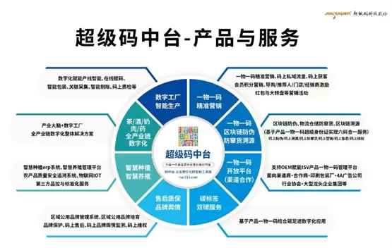 超级码中台横向为企业提供产品防伪、防窜货监管、产品溯源、精准码营销、电子质保、一码维权、产线赋码、品牌舆情监管、产品智能包装、产品碳标签等数字化经营服务;纵向可为国内各行各业、各机构组织提供一物一码标识解析开放平台,构建国家工业互联网标识解析体系节点应用。