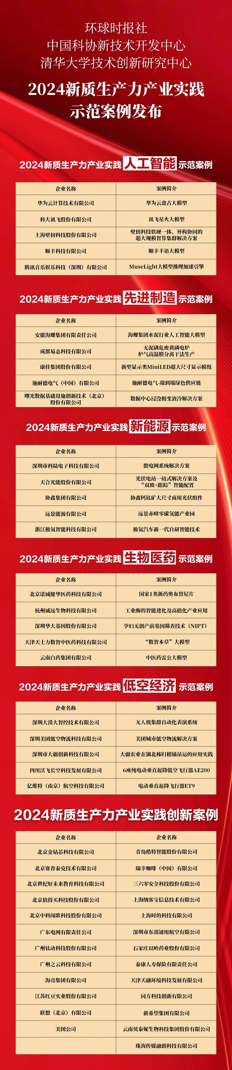 1月8日,环球时报社、中国科协新技术开发中心和清华大学技术创新研究中心联合发布了50大“新质生产力产业实践示范案例”,除人工智能、先进制造、新能源、生物医药、低空经济五大热门领域各5个科技突破案例之外,还有在各行各业做出创新探索的案例共25个。