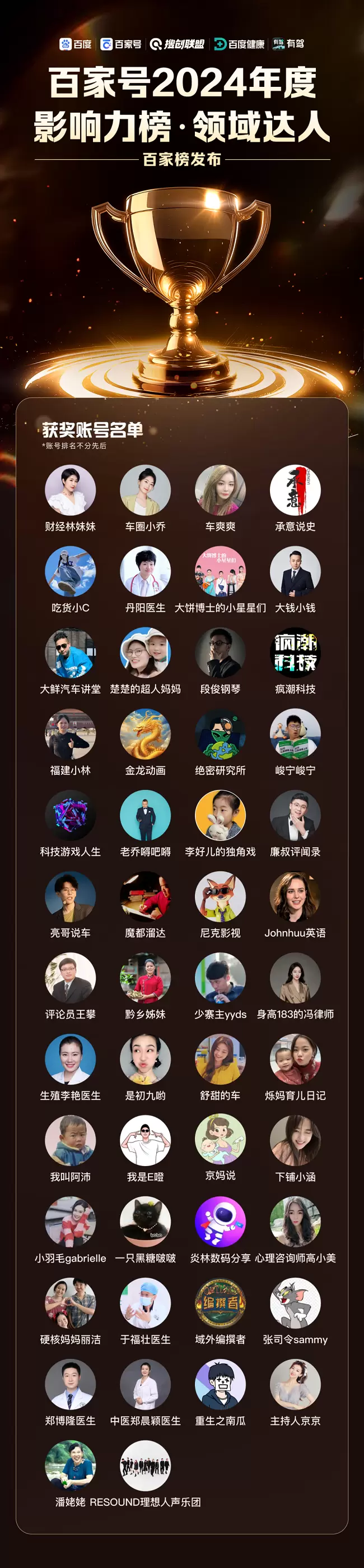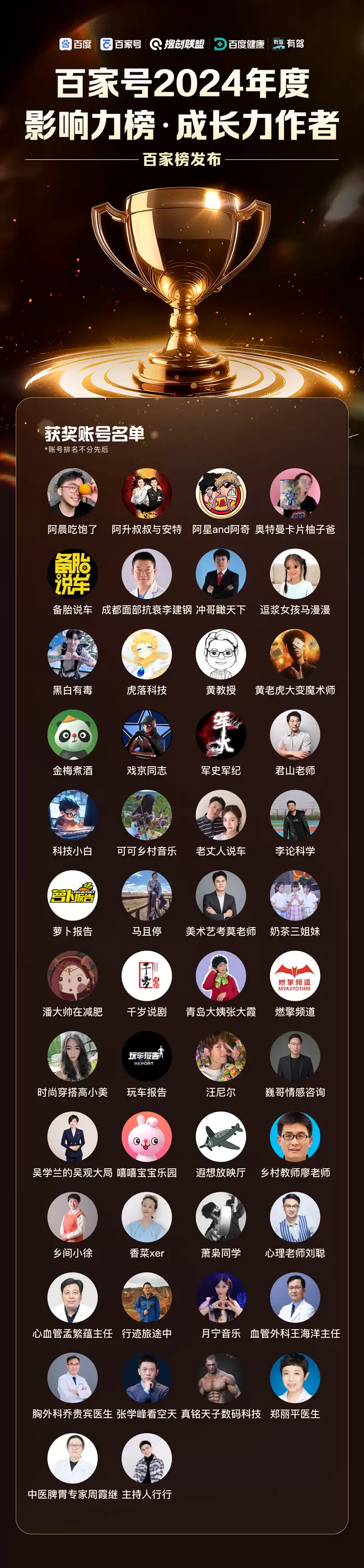 「百家号2024年度影响力榜」致力于激励平台最具影响力的作者。本年度综合评估创作者的影响力、成长力、健康度等多个维度,共计选拔出100位优质作者,特此进行表彰。