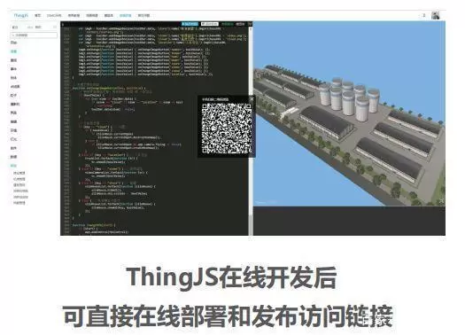 在ThingJS网站编码保存后,立即在线部署完成。可自动生成访问二维码,供用户PC端和手机访问相关3D可视化应用。