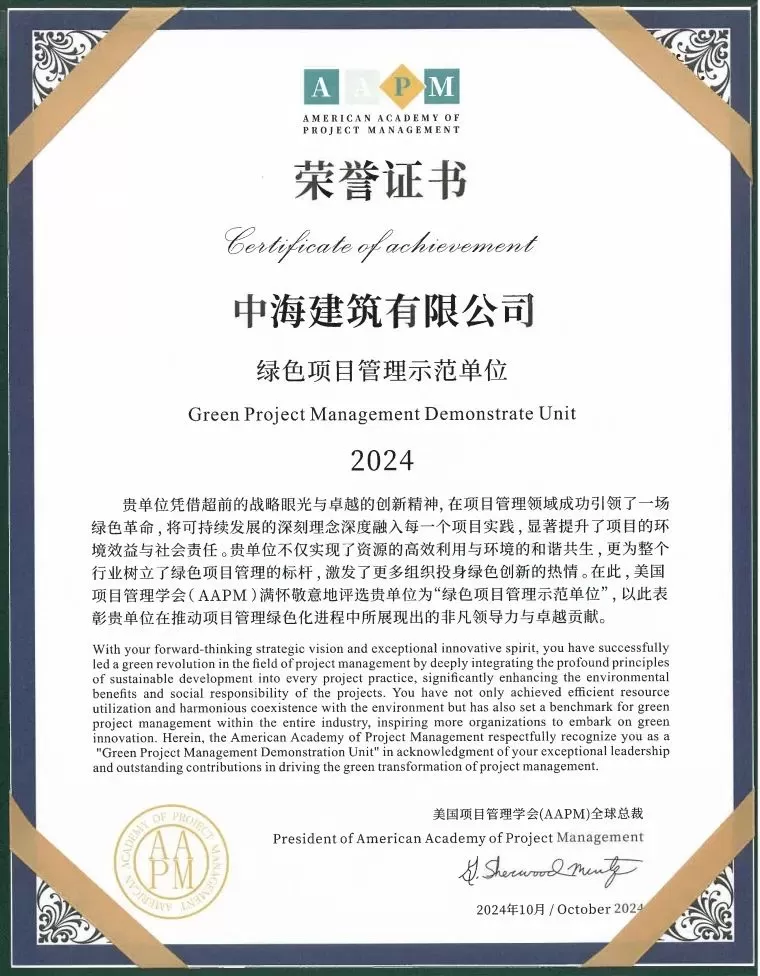 近期举行的2024年度AAPM“绿色项目管理”评选活动中,中海建筑凭借模块化集成建筑(MiC)技术、模块化集成机电系统技术(MiMEP)、光伏建筑一体化技术(BIPV)、“光储直柔”智能微电网系统、C-SMART智慧管理平台、碳中和云平台、智慧运维管控云平台等前沿技术在绿色项目管理领域的卓越表现,赢得了“绿色项目管理示范单位”的荣誉。