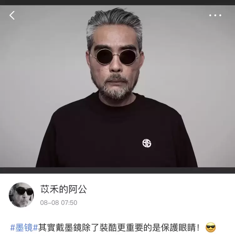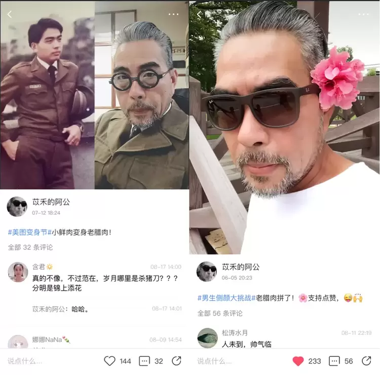 参加美图秀秀的社区话题,阿公凹起造型来不输小哥哥小姐姐。每天都有新鲜涌入的粉丝留言,为阿公打call。有粉丝留言评论道,阿公的“一副墨镜也多情”。