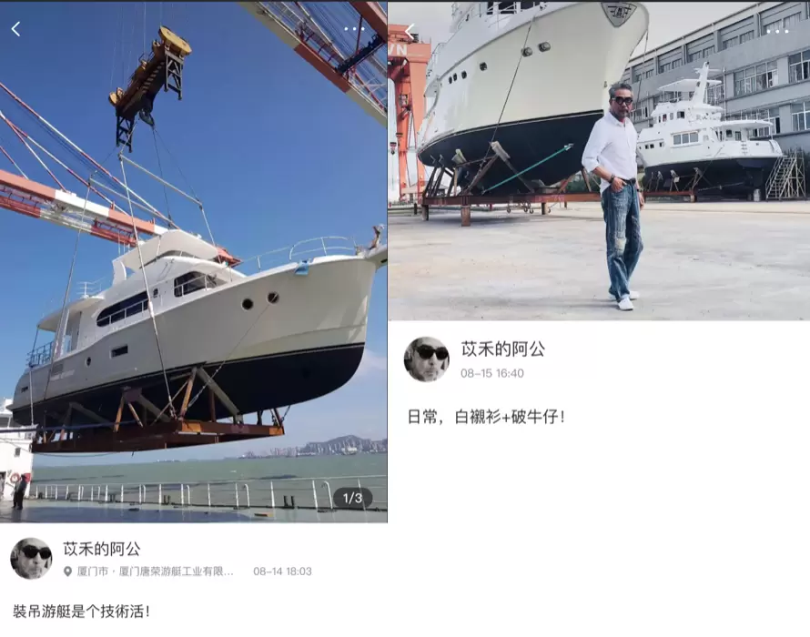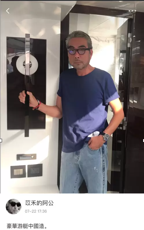 “巡视”游艇时,“职场阿公”比“时尚博主阿公”更增添一份霸气。谈到中国制造的游艇,阿公字里行间满满的都是民族自豪感。