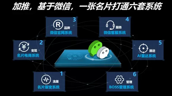 加推人工智能名片其实是一款超级微信智能销售系统,它直接对接微信 10 亿用户,由微信官网系统、名片电商系统、微信客服系统、AI雷达系统、BOSS管理系统、名片裂变系统组成,不仅将为企业用户搭建自己专属的移动官网,还能全面提升销售管理效率,可以说在这个领域具有绝对优势地位。