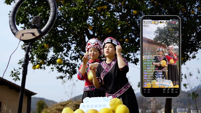 在桃子岔村,果农们通过中国移动5G直播,向网友推介贡水白柚